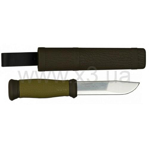Mora Outdoor 2000 с клинком из нержавеющей стали - наиболее оптимальный выбор среди разнообразия моделей, ведь такой клинок требует наименьшего внимания и совершенно неприхотлив. Рукоять ножа выполнена из резинопластика, она имеет очень хорошее сцепление с ладонью и избегает проскальзывания в руке. Ее легко удерживать благодаря удобной форме и плавным изгибам. Простые, но в то же время, надежные ножны обеспечивают хорошее удержание ножа. Благодаря поясной петле их можно носить на ремне.