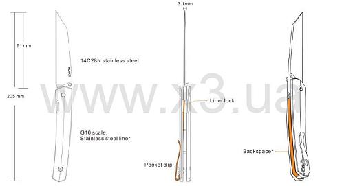 Представленный нож открывается с помощью односторонней клипсы (ориентирована под использование правой рукой). В открытом виде фиксация клинка осуществляется с помощью замка Liner-lock.