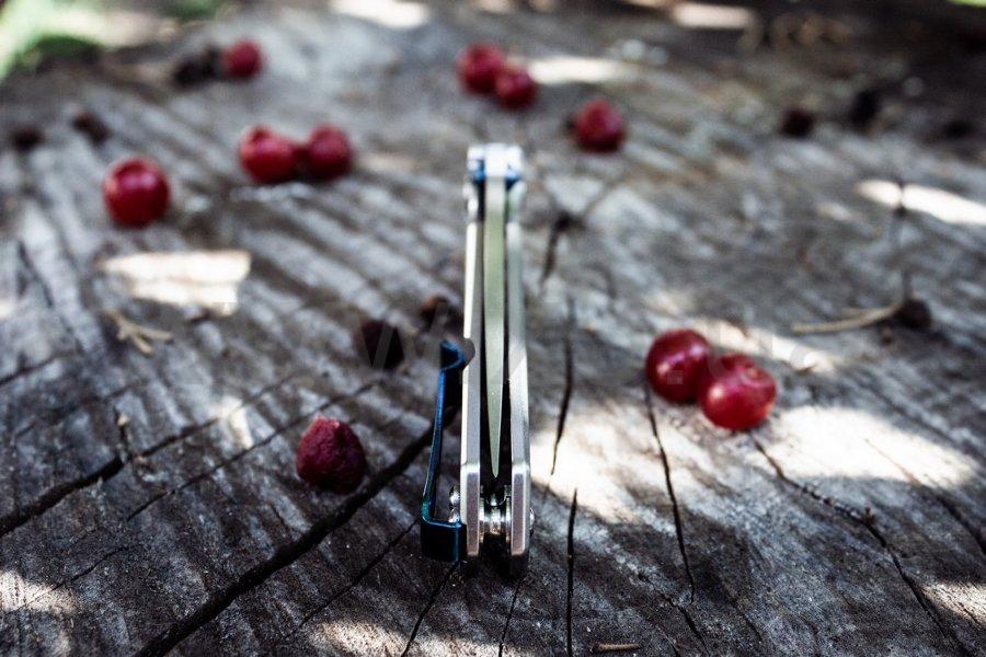 к одной из плашек рукояти крепится съемная металлическая клипса синего цвета;