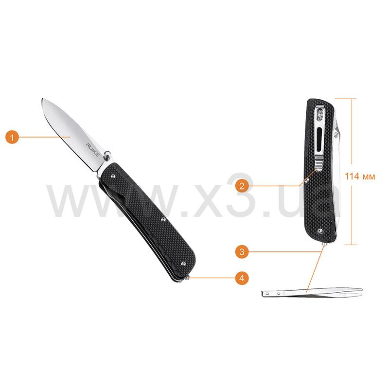 в открытом положении нож имеет длину 199 мм, а в закрытом — 114 мм;