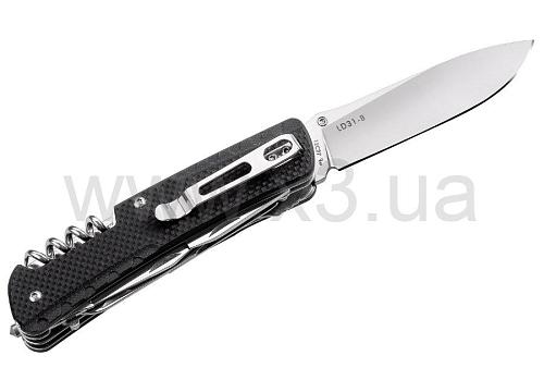 Помимо клинка с гладкой заточкой, данная модель также имеет подпружиненные ножницы, отвертку с плоским шлицем, совмещенную с открывалкой, многофункциональное шило, стропорез (клинок с волнообразной заточкой), откидное кольцо для крепления темляка, штопор, съемные щипцы и стеклобой.