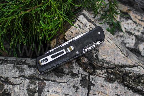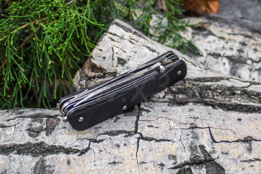 Накладки на рукоять выполнены из стеклопластика G10. Этот материал устойчив к различным механическим воздействиям, температурным перепадам, повышенной влажности и не «выгорает» под воздействием солнечных лучей.