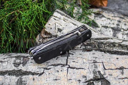 Основным инструментом в представленной модели является клинок формы Drop-point с гладкой заточкой режущей кромки. Он открывается с помощью одностороннего шпенька и в «рабочем» положении фиксируется замком типа Liner-lock. Среди дополнительных инструментов присутствуют пила для работы с древесиной, отвертка с плоским шлицем, совмещенная с открывалкой, стропорез с волнообразной заточкой, откидное «ушко» для крепления темляка, штопор, щипцы и стеклобой.