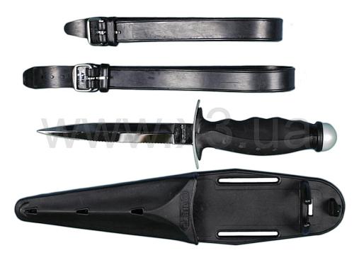 Рукоятка из мягкого противоскользящего материала. Полужесткие ножны. Крепится как на ноге, так и к поясу.