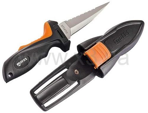 Нож Mares Stiletto компактный нож для подводной охоты с острым лезвием. Лезвие из нержавеющей стали с серейтером. Лезвие 75 мм длинной, 4 мм толщиной. Мягкая рукоятка с защелкой. Жесткие ножны. Крепится как к ноге, так и к поясу.