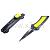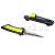 Рукоять и ножны выполнены из пластика с противоскользящими вставками яркого цвета. Кнопка-фиксатор надёжно удерживает нож в ножнах,а также позволяет доставать его одной рукой.