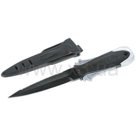 Плоская модель ножа снижает сопротивление воды, снижает вероятность зацепиться под водой за любые из препятствий. Система фиксации ножа надежно фиксирует нож в ножнах. Позволяет подводному охотнику быстро извлечь его одной рукой.