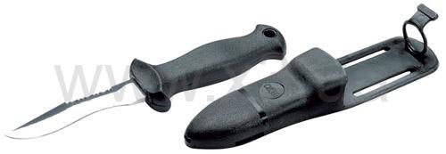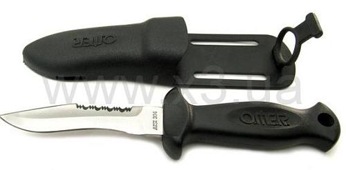 Нож подводного охотника, небольшого размера в классических ножнах с резиновым кольцом.