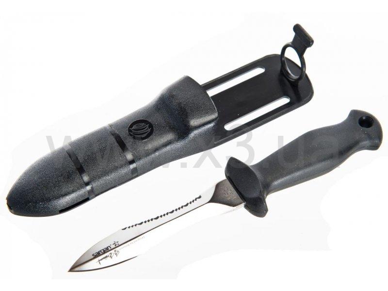 Нож Подводного Охотника - "ТУРГОЯК ", рекомендуется размещать на левой стороне груди, (на штатных клипсах костюмов SARGAN), что гарантирует быстрое и легкое извлечение ножа из ножен, любой рукой, из любого положение, одним движением и обеспечивает мгновенную готовность к применению.