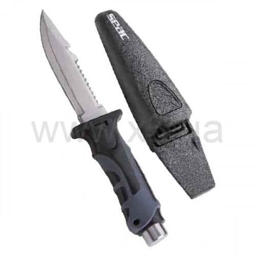 Нож для дайвинга с лезвием из закаленной нержавеющей стали AISI 420 и молотком с торцевой головкой из нержавеющей стали на конце рукоятки. Лезвие длиной 120 мм, с прямым краем с одной стороны и зубчатым краем + линейный резак с другой. Ручка, отлитая из мягкой термопластичной резины, обеспечивает нескользкую поверхность для безопасного захвата. В конце захвата предусмотрено отверстие для крепления линии. Жесткая оболочка с большой пусковой кнопкой в центре.