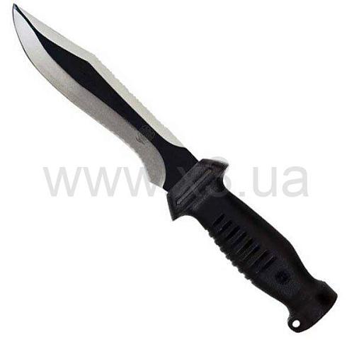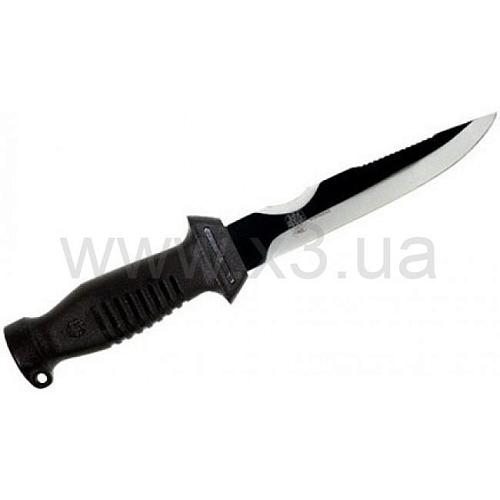 Область применения: подводная охота. Твердость, марка стали: AISI 420 MA 3M. Материал рукоятки: полипротилен. Способ фиксации: резиновая петля. Спец. функции – серейтер, пила. Малый вес. Эргономическое строение рукоятки с отверствием для фиксации крепежа. Имеет c одной стороны острый, с другой зазубренный край. Наличие пластикового упора.