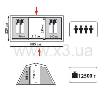 Двухслойная кемпинговая палатка с двумя входами и большим тамбуром. Входы спальных отделений продублированы москитными сетками. Тент палатки оборудован юбкой. У палатки 2 больших вентиляционных окна. Все швы палатки проклеены. Съемный пол в тамбуре.