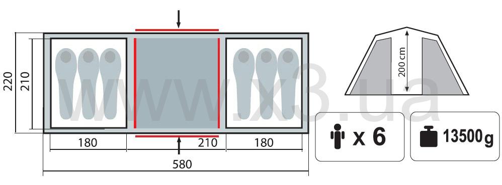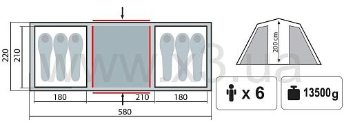 Двухслойная кемпинговая палатка с двумя входами и большим тамбуром. Входы спальных отделений продублированы москитными сетками. Тент палатки оборудован юбкой.
