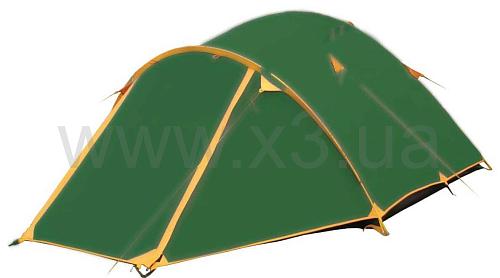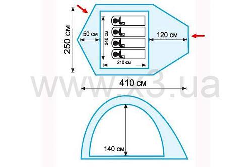 Двухслойная палатка с двумя входами. У палатки большой вместительный тамбур. Палатка имеет 2 вентиляционных клапана с регулируемой по высоте стойкой. Все швы палатки проклеены.