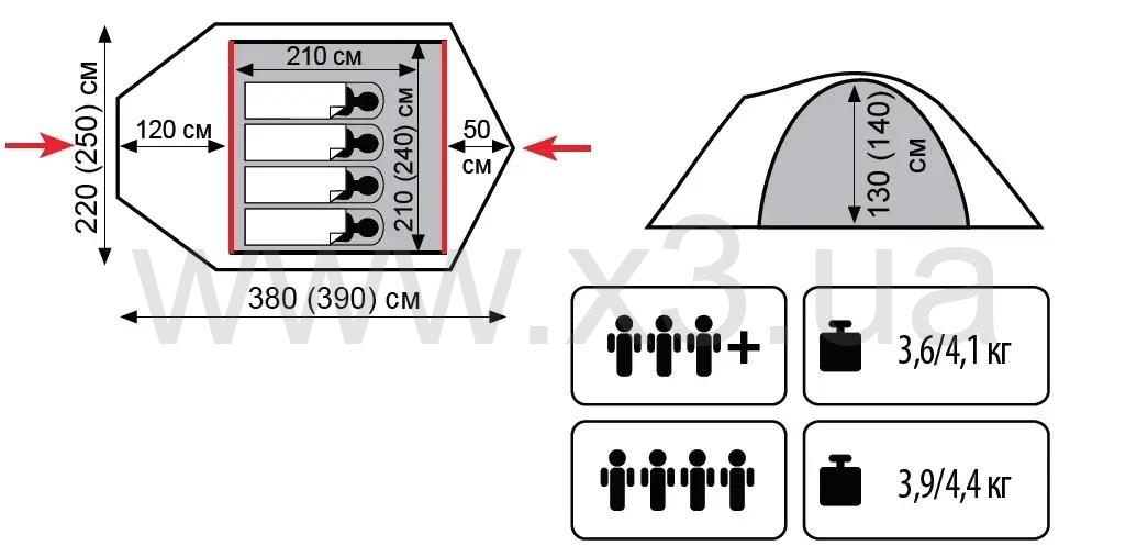 Тент: 100% полиестер 75D/190T WR PU 4000 мм. в. ст.