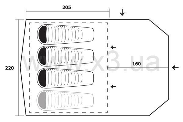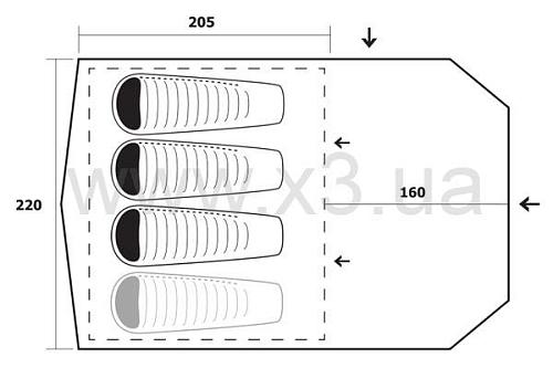 Палатка для 3-4 человек с большим и просторным тамбуром, в который можно войти с двух сторон. Его пространство можно использовать для вынужденных ночёвок или для хранения велосипедов и др. Палатку также можно использовать для семейного отдыха. Преимуществом палатки является достаточный комфорт и вариабельность использования.