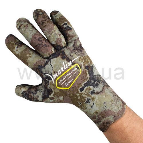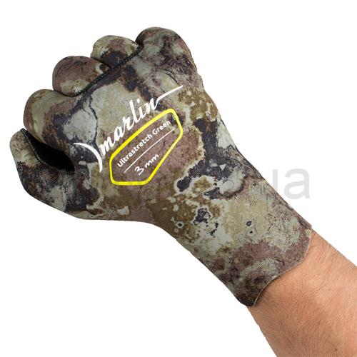Перчатки Marlin Ultrastretch (Марлин Ультрастреч) сделаны из эластичного неопрена фирмы Шейко, покрытого сверхрастяжимым нейлоном ultrastretch. Анатомический крой обеспечивает плотное, но комфортное обжимание кисти, сохраняя её чувствительность при эксплуатации, предотвращая при этом циркуляцию воды и сберегая тепло. Нейлон внутри даёт возможность надевать перчатку на сухую кисть (без мыльного раствора). Прорезиненная поверхность ладоней позволяет уверенно удерживать предметы в воде.