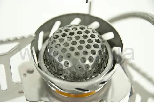 Благодаря двухкомпонентной инновационной системе ветрозащиты: встроенному в корпус защитному экрану и сетке конфорки из износостойкого и жаропрочного сплава, сконструированной по принципу сот, которая при нагревании обеспечивает дополнительную обтекаемость остатков ветряных порывов прошедших сквозь первую ступень защиты - ветрозащитного экрана, а так же дополнительную стойкость пламени без потери коэффициента полезного действия, обеспечивая тем самым существенную экономию топлива.