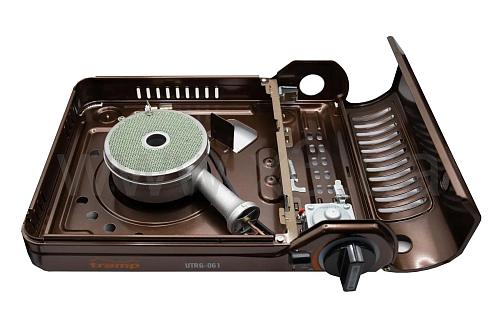 Компактная туристическая одноконфорочная газовая плита Tramp UTRG-061 с инфракрасной (практически без открытого пламени) керамической конфоркой и переходником на большой баллон.