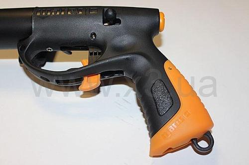 Удобная рукоять. Она имеет более хороший хват, выполнена в черно-оранжевом цвете благодаря чему вы легче найдете в мутной воде потерянное ружье.