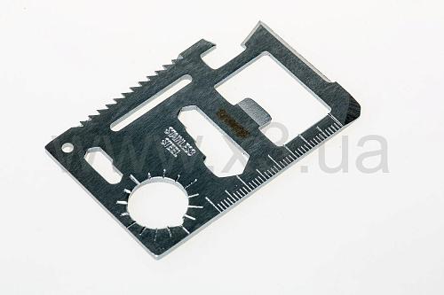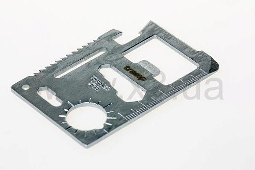 - при всей своей миниатюрности мультитул-карта гармонично соединила в себе одиннадцать разнообразных инструментов: консервный нож, ключ для открывания барашковых гаек, пила, отвертка плоская, отверстие в углу для гнутья проволоки или крепления карты к кольцу, гаечные рожковые ключи четырёх размеров, гаечные рожковые ключи двух размеров, линейка, транспортир на 16 направлений, открывалка для бутылок, боковой нож;