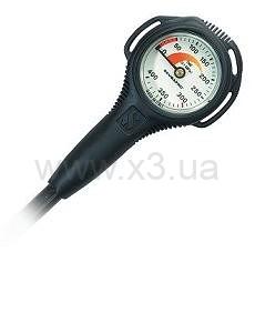 Самый маленький из резервных приборов. Высокопрочный шланг расчитан на давление до 400 атмосфер. Две дополнительные петли на корпусе по бокам для удобства крепления. Цена деления шкалы 10 бар. У основания подключения шланга к порту ВД установлен протектор, защищающий от изломов.