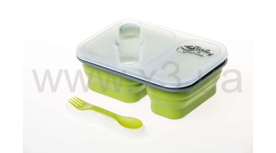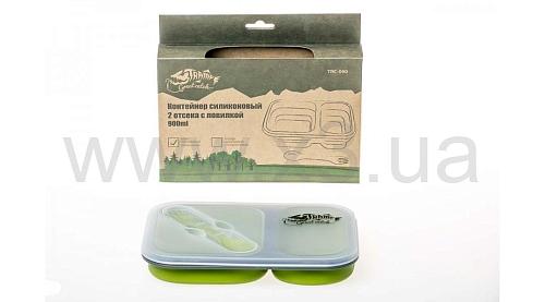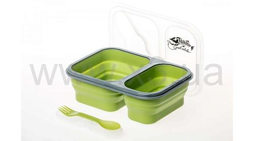 Дорожный складной контейнер для еды на 2 отдельных отсека из пищевого силикона Tramp TRC-090 объемом 900 мл, может использоваться как походная миска, ланч-бокс. Контейнер укомплектован небольшой ловилкой , котрая храниться в крышке контенера