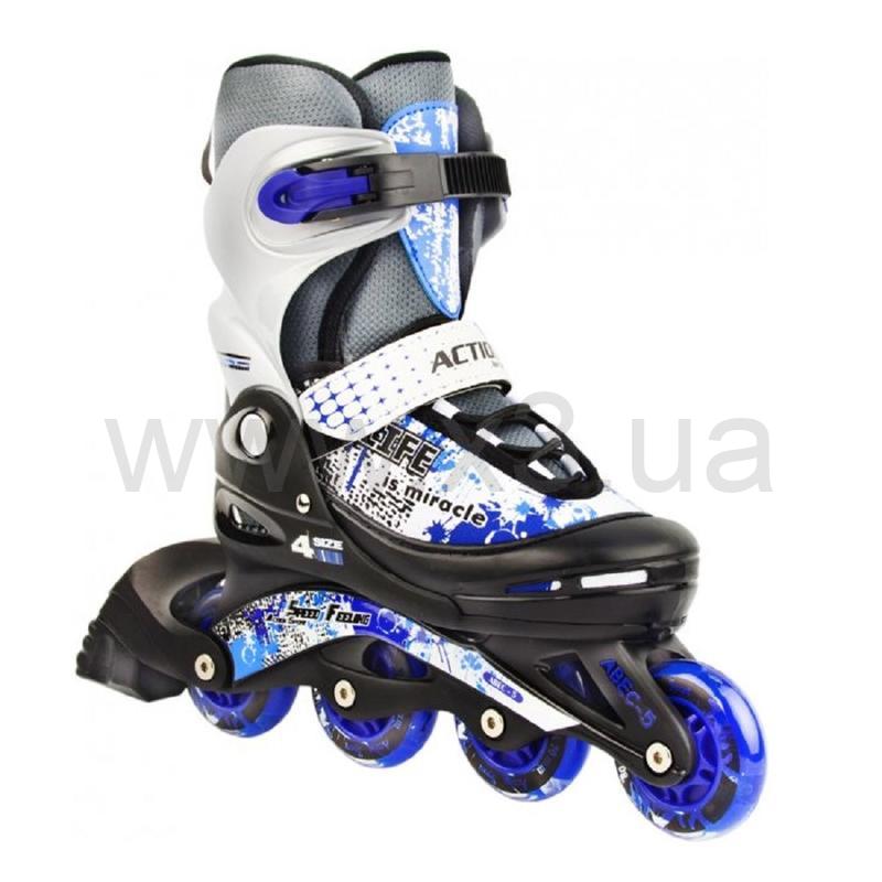 Action ZERO - набор, предназначенный для начинающих роллеров, отличный выбор для первых роликов. Дизайн модели выполнен в классических черном и светло-серых тонах с оригинальным синим принтом. Раздвижной внешний ботинок из полипропилена и мягкого нейлона надежно удерживает и защищает ногу от повреждений и возможных ударов. Быстрая система с одной кнопкой позволяет быстро отрегулировать размер в пределах 4-х доступных вариантов либо использовать коньки на вырост. Шнуровка ботинка укреплена ремешком-липучкой, а также двусторонней застежкой AUTO LOCK.