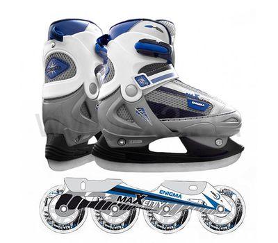 MaxCity Enigma Combo Boy - набор раздвижных роликов-коньков со сменными рамами. В комплект поставки входят ледовые лезвия из легированной стали и роликовая рама с колесами 64mm PU. Рамы легко меняются в течении нескольких минут, для этого необходимо раскрутить крепления, заменить раму и обратно затянуть крепежи. В наборе есть все необходимые ключи.