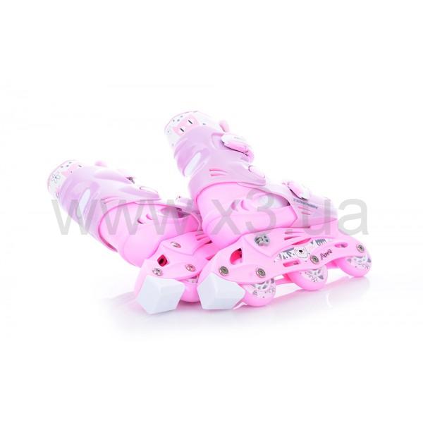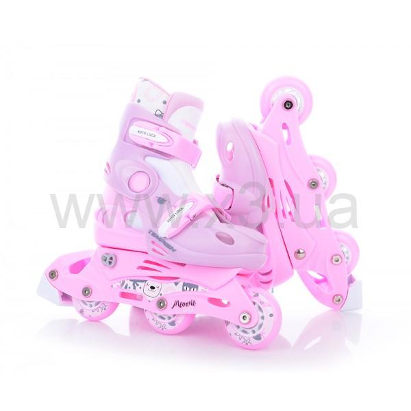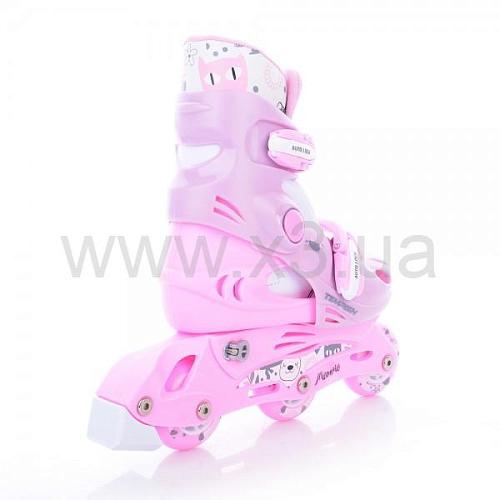 Роликовые коньки Tempish Kitty Baby Skate - раздвижные детские роликовые коньки для девочек. Отличный комплект для Вашего ребенка, включающий в себя роликовые коньки, сумочку, наколенники, налокотники, накладки на запястья, шлем и систему для перестановки двух задних колес на одну ось с необходимыми инструментами.