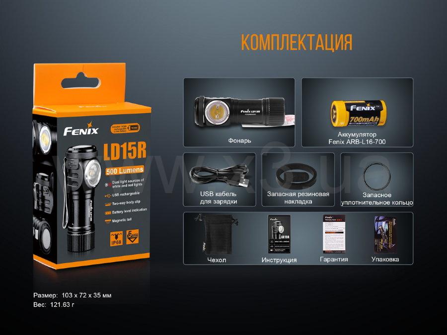 Комплектация: Фонарь, аккумулятор Fenix ARB-L16-700, USB кабель для зарядки, запасная резиновая накладка, запасное уплотнительное кольцо, чехол, инструкция, гарантия.