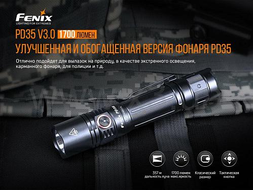 Fenix PD35 V3.0 предназначен для решения тактических задач, и даёт максимальную яркость света в 1700 люменов. При этом дальнобойность луча достигает 357 метров. Диод: Luminus SFT40. Доступны шесть режимов яркости, фонарь хорошо защищён от перегрева корпуса, он полностью водонепроницаемый и довольно прочный. Есть индикация уровня заряда батареи. Габариты составляют 134*25,4*22,8 миллиметра, весит 83,5 грамма (без учёта батареи).