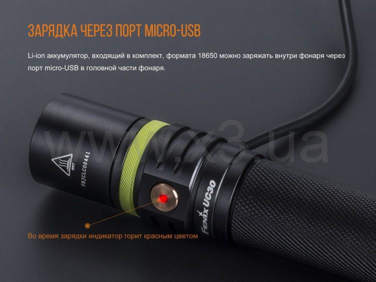 В базовом комплекте с моделью Fenix UC302017 предлагается аккумулятор на 2600 мАч, формата 18650. Вместо него без проблем можно использовать и другой аналогичный по типоразмеру аккумулятор, либо приобрести второй в качестве запасного. Кроме того, предусмотрена функция зарядки аккумулятора прямо внутри фонаря, подключив его к внешнему power-банку кабелем USB (такой кабель также есть в комплекте). В течение всего времени зарядки индикатор, встроенный в фонарь под кнопкой управления, будет светиться красным. Как только его свет переключится на зеленый, процесс зарядки завершен. Этот индикатор также поможет пользователю контролировать ход использования энергии аккумулятора. Пока он светится зеленым, уровень заряда — выше 85%. Если зеленая лампочка начинает мигать, значит осталось 50-85% изначального заряда. В диапазоне 25-50% светиться будет уже красная лампочка, которая начнет мигать при снижении заряда более чем до 25%.