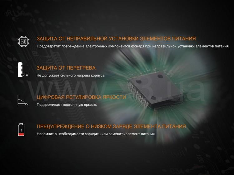 По традиции, принятой для фонарей Fenix, в этой модели также используется защита от переполюсовки, слишком сильного нагревания оптического узла, автоматически регулируется стабильная яркость в каждом режиме. Благодаря этим мерам, использовать фонарь Fenix UC302017 удобно и просто, а его работа является надежной и долговечной.