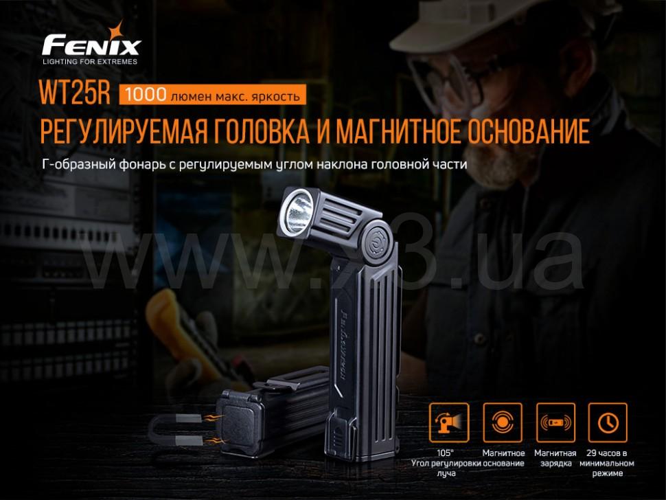 Фонарь модели Fenix WT25R, аккумулятор ARB-L18-3400 Li-ion, магнитный USB-кабель для зарядки, кольцо для подвешивания, ремешок, запасное уплотнительное кольцо, памятка, информационная листовка, инструкция пользователя, талон гарантии.
