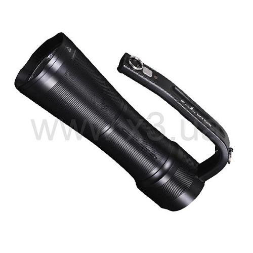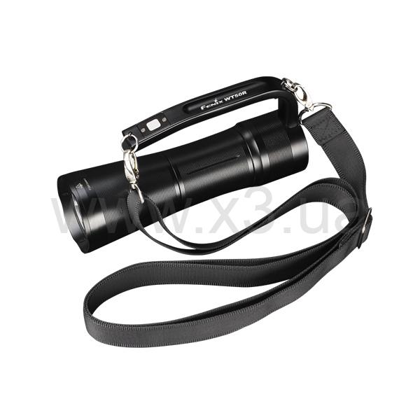 Фонарь Fenix WT50R довольно крупный по размеру и тяжелый. Он весит 742 г, поэтому в комплекте с фонарем есть широкий ремень на плечо. С ним использовать фонарь на протяжении длительного времени будет удобнее. Также его можно установить на штатив, ведь на корпусе есть стандартный разъем для крепления на трипод.