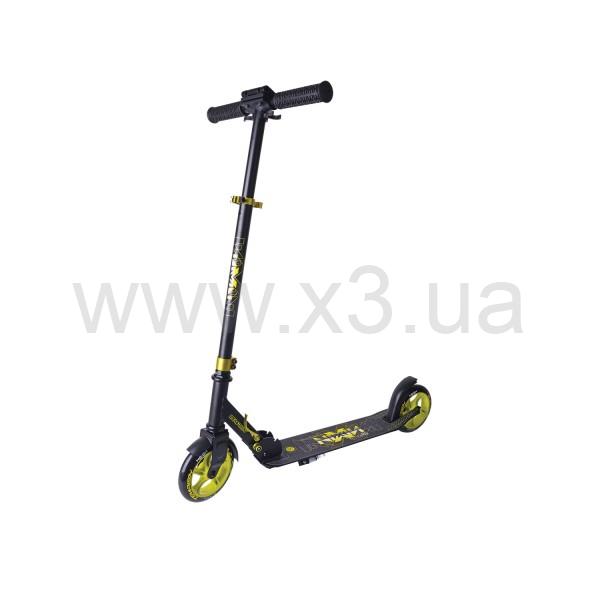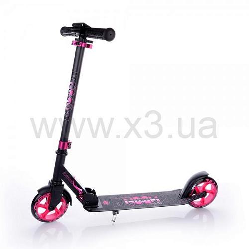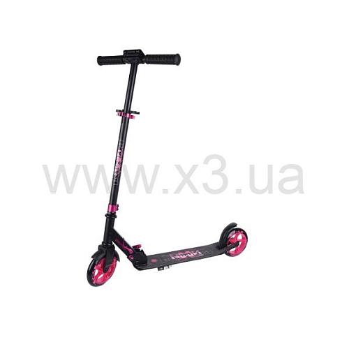 Самокат выполнен в практическом черном цвете со стильными вставками на раме и колесах.