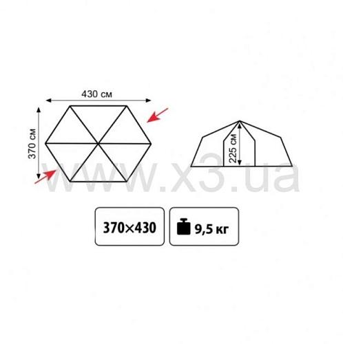 Размер шатра 3.5 метра на 4.7, высота - 2.25 метра, что позволяет стоять высокому взрослому человеку в полный рост не сгибаясь.