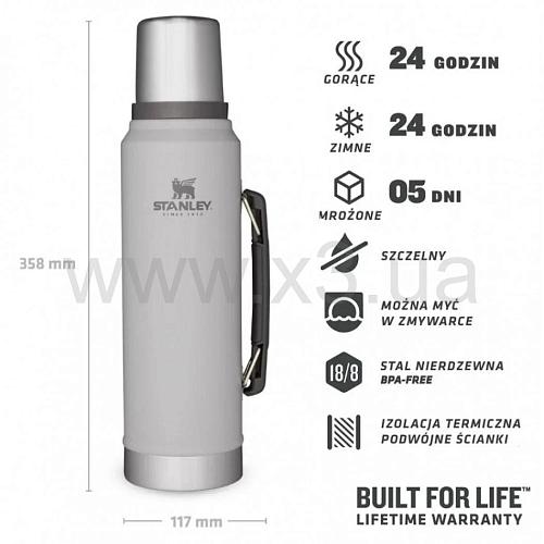 Термос Stanley Legendary Classic Ash 1 л – легкий, компактный и эргономичный термос для длительного хранения и удобной транспортировки любимых напитков на работу, учебу, в дальние поездки, на охоту и рыбалку. Термос одинаково хорошо подходит для хранения горячих и холодных напитков: зимой Вы можете носить с собой горячие согревающие напитки, а летом – прохладные освежающие. Термос выполнен из высококачественной пищевой нержавеющей стали, которая не подвергается коррозии, не поглощает запахи и вкусы напитков, а также не содержит вредный ВРА, поэтому полностью безопасен для хранения напитков. Термос компактно разместится в рюкзаке или сумке, и Вы в любой момент сможете насладиться чашечкой горячего чая или освежающего свежеприготовленного лимонада. Чашку с собой носить не обязательно, ведь крышка отлично справляется с этой функцией.
