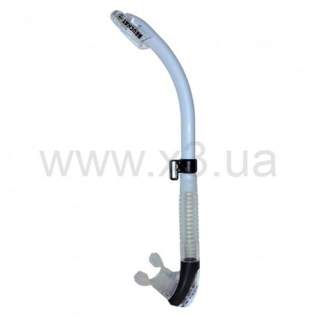 Поперечное сечение - эллипсоидальной формы для снижения сопротивления. Имеется верхняя насадка от захлестывания волной и нижний дренажный клапан. Загубник изготовлен из мягкого гипоаллергенного силикона, с возможностью замены на любой стандартный загубник от регулятора. Гофрированная вставка позволяет без помех использовать трубку при плавании с аквалангом. Клапанная коробка с загубником имеет возможность вращения вокруг продольной оси трубки.
