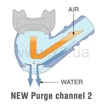 Дренажный клапан, расположенный под идеальным углом, устраняет эффект бульканья остаточной воды при дыхании и отводит пузырьки воздуха от лица.