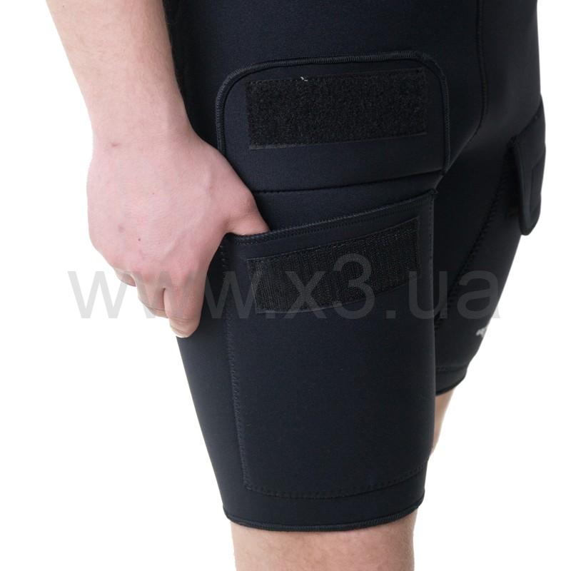 Шорты изготовлены из эластичного неопрена толщиной Змм. Анатомический крой обеспечивает идеальную посадку по фигуре. Внутреннее покрытие – открытая пора, снаружи дублированная нейлоном. Имеется два кармана для грузов.