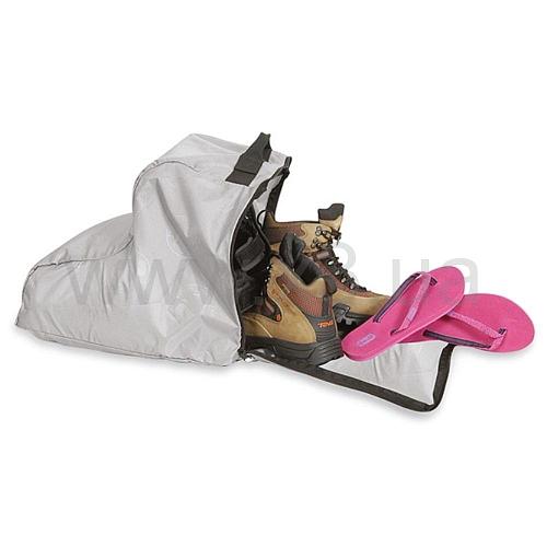 Чехол для хранения обуви Tatonka Trekking Shoe Bag. Главным назначением чехла является хранение и транспортировка обуви во время кемпинга и долгих путешествий. На передней части имеется специальное прозрачный карман для помещения туда своего имени, что может пригодится при сдаче багажа в аэропорте. Изготовлен по форме верхней обуви. Также оснащен удобной ручкой для переноски в руках. Выполнен из высокопрочного полиэтера плотностью в 200 ден.