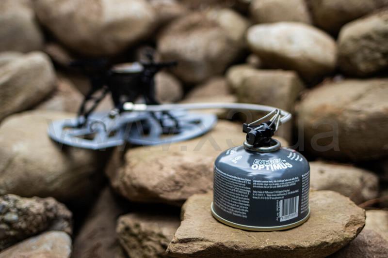 Под вогнутое дно баллона размера M (объем 230 г) помещается горелка Optimus Crux в сложенном виде.