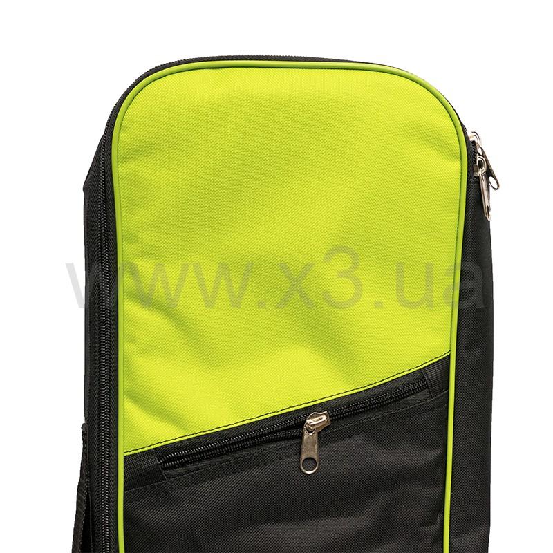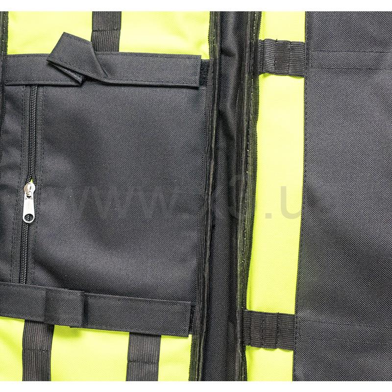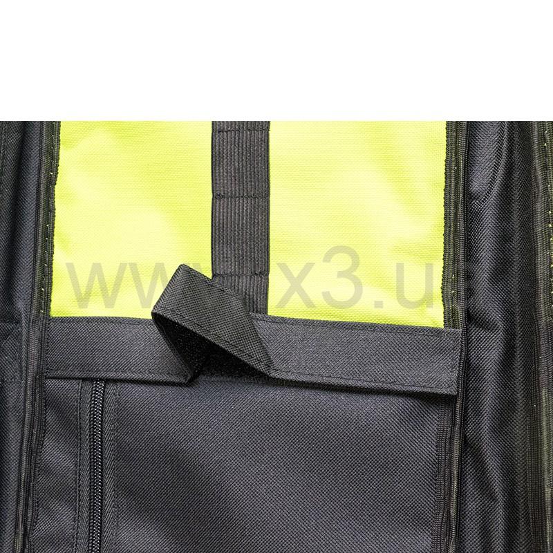 На лицевой стороне есть карман на молнии для необходимых мелких аксессуаров. Одна из внутренних стенок имеет крепежи для ружья в виде двух строп-липучек, они способны закрепить полностью снаряженное ружьё с физической длиной до 80 см - с подствольным фонарем и катушкой. Также на этой стороне расположены карман и резинки для необходимых аксессуаров: наконечников, заряжалки, фонаря. На противоположной стороне, под молнией, расположен универсальный карман с регулируемой длиной. На этой же стороне имеются резинки для фиксации гарпунов.