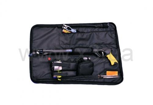 Имеет специальные места для размещения всего ружейного комплекса: катушка, фонарь, запасные гарпуны и наконечники, ЗиП и паспорт на ружье. Для удобства переноски есть регулируемый плечевой ремень и объемная пластиковая ручка.