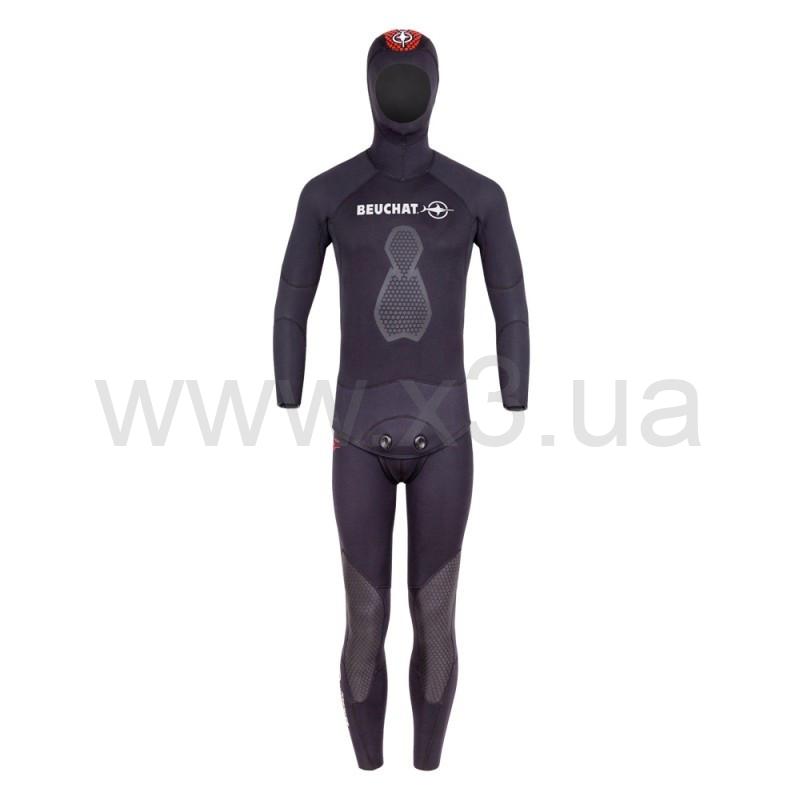 В разработке гидрокостюа Beuchat Espadon-3 9мм для подводной охоты было вложено множество новых идей. Внешне Espadon – это все тот же классический черный гидрокостюм с «открытой порой» внутри, и нейлоном снаружи с курткой и комбинезоном. Но по сути – это принципиально новый анатомический крой. Все неопреновые элементы скреплены и проклеены вместе. Была переработана форма поясничного изгиба, а также паховая область для более плотного прилегания к телу. «Проблемные места» подмышек, локтевых сгибов и внутренних частей коленей теперь не будут раздражаться во время долгой охоты, благодаря бесшовным вставкам в этих зонах. Шлем костюма Espadon был переработан и имеет меньшее лицевое отверстие. Края рукавов были уплотнены и оснащены эластичным швом, а край куртки обметан эластичной лентой для прочности. Усиленная защита на коленях продлевает срок службы костюма. Все это призвано дать подводному охотнику свободу движения и комфорт, отличное прилегание костюма к телу и сохранение тепла на все время подводной охоты.