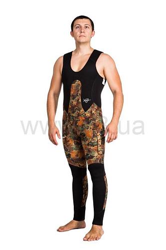В брюках-комбинезоне в области майки применяется меньшая толщина неопрена (в моделях толщиной 7 и 9 мм), для облегчения дыхания охотника, в то же время, в районе солнечного сплетения добавлена специальная вставка из более толстого неопрена, для облегчения зарядки ружья.