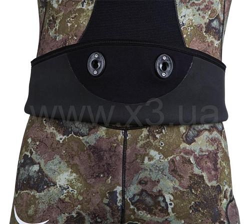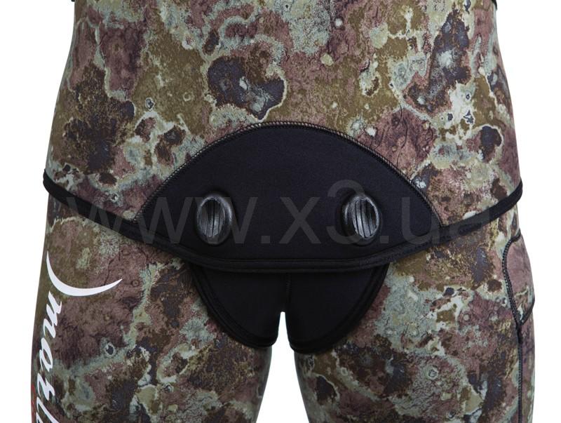В брюках-комбинезоне в области майки применяется меньшая толщина неопрена (в моделях толщиной 7 и 9 мм), для облегчения дыхания охотника, в то же время, в районе солнечного сплетения добавлена специальная вставка из более толстого неопрена, для облегчения зарядки ружья.