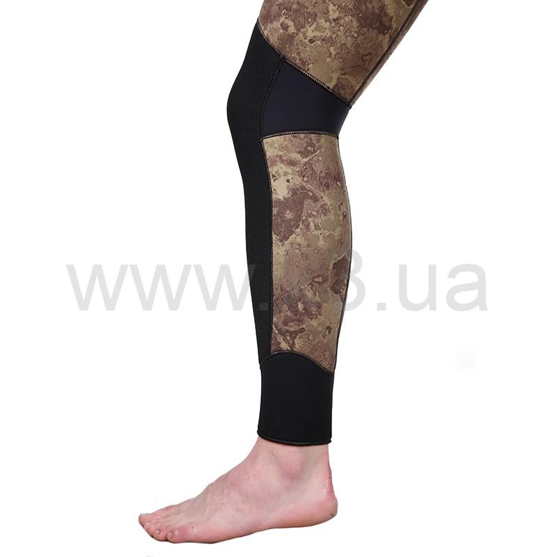 В брюках-комбинезоне в области майки применяется меньшая толщина неопрена (в моделях толщиной 7 и 9 мм), для облегчения дыхания охотника, в то же время, в районе солнечного сплетения добавлена специальная вставка из более толстого неопрена, для облегчения зарядки ружья.